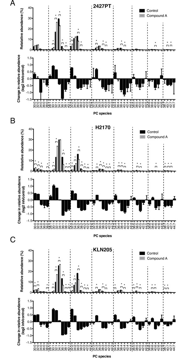 Figure 6: Reversal of the elongation phenotype by chemical inhibition of ELOVL6 in lung SCC cells. A. 2427PT, B. H2170 and C. KLN205 cells were treated with the ELOVL6 inhibitor Compound A (1 μM) for 72h and control cells were treated with vehicle. The relative abundance and changes in relative abundance (log2) of PC after ELOVL6 inhibition are shown. Changes in lipids were analyzed and presented as in Figure 5. Data represent mean (n=3) ± standard deviation. * Indicates statistical significance after multiple testing using the Holm-Sidak method with alpha=0.05.