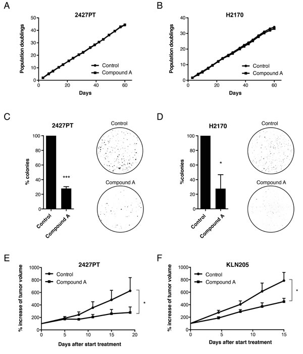 To investigate whether chemical inhibition of ELOVL6 may have potential for therapeutic intervention, we examined the impact of Compound A on tumor growth in vitro and in mouse models in vivo. Surprisingly, despite the major changes in lipid composition, inhibition of ELOVL6 by Compound A did not result in any significant difference in cell proliferation, both in 2427PT cells and in H2170 cells grown as a monolayer on a solid surface (Figure 8A and 8B). However, in colony formation tests in soft agar, Compound A-treated cells showed a dramatic decrease in colony formation compared to vehicle-treated cells for both cell lines (Figure 8C and 8D). In addition, daily systemic administration of Compound A by oral gavage significantly attenuated tumor growth in nude mice bearing 2427PT-derived subcutaneous xenografts (Figure 8E). Moreover, also local chemical inhibition of ELOVL6, via intra-tumoral injection of Compound A, significantly attenuated tumor formation by KLN205 SCC cells grown as subcutaneous xenografts in syngeneic DBA/2 mice (Figure 8F).