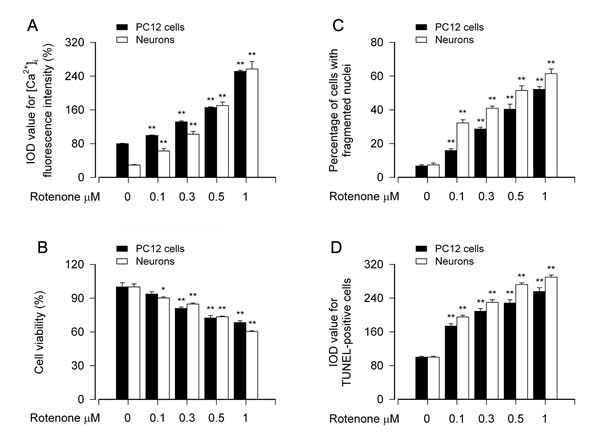 Figure 1: Rotenone-induced [Ca2+]i elevation is associated with cell viability reduction and apoptosis in neuronal cells. PC12 cells and primary neurons were treated with rotenone (0-1 μM) for 24 h. [Ca2+]i fluorescence intensity was imaged and quantified using an intracellular Ca2+ indicator dye Fluo-3/AM (A). Cell viability was determined by the MTS assay (B) and cell apoptosis was assayed using DAPI and TUNEL staining (C, D). A.-D. Rotenone concentration-dependently elicited [Ca2+]i elevation (A), and induced viability reduction (B) and apoptosis (C, D) in PC12 cells and primary neurons. Results are presented as mean ± SE (n = 5). *P < 0.05, **P < 0.01, difference with control group.