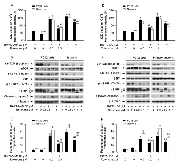 Figure 2: Rotenone elicits neuronal apoptosis via Ca2+-mediated inhibition of mTOR pathway. PC12 cells and primary neurons were pretreated with/without BAPTA/AM (30 µM) or EGTA (100 µM) for 1 h and then exposed to rotenone (0.5 and 1 µM) for 24 h. [Ca2+]i fluorescence intensity was imaged and quantified using an intracellular Ca2+ indicator dye Fluo-3/AM (A, D), Total cell lysates were subjected to Western blotting using indicated antibodies (B, E). The blots were probed for β-tubulin as a loading control. Similar results were observed in at least three independent experiments. Cell apoptosis was assayed using DAPI staining (C, F). A.-F. Pretreatment with BAPTA/AM or EGTA significantly attenuated elevation of [Ca2+]i level (A, D) and inhibition of phosphorylation of mTOR, S6K1 and 4E-BP1 (B, E) in PC12 cells and primary neurons induced by rotenone, and obviously recused the cells from rotenone-induced cleaved-caspase-3 (B, E) and apoptosis (C, F). Results are presented as mean ± SE (n = 5). aP < 0.05, difference with control group; bP < 0.05, difference with 0.5 µM rotenone group; cP < 0.05, difference with 1 µM rotenone group.