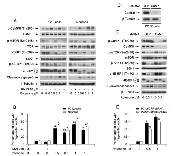 Figure 4: Pharmacological inhibition of CaMKII or downregulation of CaMKII partially prevents rotenone-induced inhibition of mTOR signaling and apoptosis in neuronal cells. PC12 cells and primary neurons, or PC12 cells infected with lentiviral shRNA to CaMKII or GFP (as control), were treated with rotenone (0.5 and 1 μM) for 24 h, or pretreated with/without KN93 (10 µM) for 1 h and then exposed to rotenone (0.5 and 1 µM) for 24 h. Total cell lysates were subjected to Western blotting using indicated antibodies (A, C, D) The blots were probed for β-tubulin as a loading control. Similar results were observed in at least three independent experiments. Cell apoptosis was assayed using DAPI staining (B, E). A., B. Inhibition of CaMKII by KN93 partially prevented inhibition of mTOR, S6K and 4E-BP1 phosphorylation, cleavage of-caspase-3 (A) and apoptosis (B) in the cells induced by rotenone. C.-E. Lentiviral shRNA to CaMKII, but not to GFP, down-regulated CaMKII expression by ~90% in PC12 cells (C), which obviously attenuated retonone-induced phosphorylation of CaMKII, and conferred partial resistance to rotenone-induced inhibition of mTOR signaling and activation of caspase-3 (D), as well as apoptosis (E) in the cells. Results are presented as mean ± SE (n = 5). aP < 0.05, difference with control group; bP < 0.05, difference with 0.5 µM rotenone group; cP < 0.05, difference with 1 µM rotenone group; dP < 0.05, CaMKII shRNA group versus GFP shRNA group.