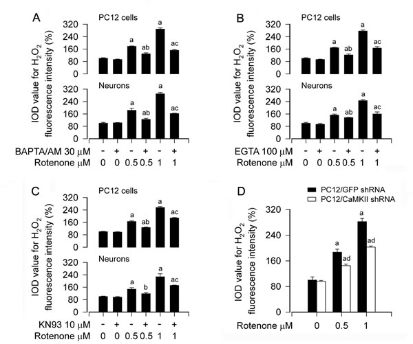 Figure 5: Rotenone evokes Ca2+-CaMKII-dependent induction of H2O2 overproduction in neuronal cells. PC12 cells and primary neurons, or PC12 cells infected with lentiviral shRNA to CaMKII or GFP (as control), were treated with rotenone (0.5 and 1 μM) for 24 h, or pretreated with/without BAPTA/AM (30 μM), EGTA (100 μM) or KN93 (10 µM) for 1 h and then exposed to rotenone (0.5 and 1 µM) for 24 h, followed by intracellular H2O2 imaging using a peroxide-selective probe H2DCFDA. A.-D. H2O2 imaging was quantified, showing that BAPTA/AM (A), EGTA (B), KN93 (C) or downregulation of CaMKII (D) dramatically attenuated rotenone-induced H2O2 generation in the cells, respectively. Results are presented as mean ± SE (n = 5). aP < 0.05, difference with control group; bP < 0.05, difference with 0.5 µM rotenone group; cP < 0.05, difference with 1 µM rotenone group; dP < 0.05, CaMKII shRNA group versus GFP shRNA group.