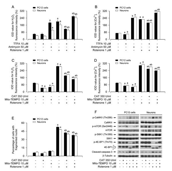 PC12 cells and primary neurons, PC12 cells infected with lentiviral shRNA to 4E-BP1 or GFP, or PC12 cells infected with Ad-mTOR, Ad-S6K1-ca or Ad-GFP, respectively, were seeded at a density of 5×105 cells/well in a 6-well plate containing a PDL-coated glass coverslip per well. Next day, cells were treated with 0-1 M rotenone for 24 h, with/without 1 µM rotenone in the presence or absence of TTFA (10 μM) or antimycin A (50 μM) for 24 h, or with/without 0.5 and/or 1 µM rotenone for 24 h following pre-incubation with/without BAPTA/AM (30 μM), EGTA (100 μM), CAT (350 U/ml) or Mito-TEMPO (10 μM) for 1 h. The cells were then loaded with 5 μM Fluo-3/AM for 40 min. Finally, all stained coverslips were rinsed twice with PBS, followed by imaging under a fluorescence microscope. IOD for quantitative analysis of the fluorescence intensity was analyzed by Image-Pro Plus 6.0 software as described above.