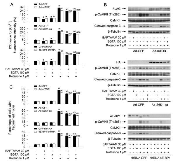 Figure 7: Ectopic expression of wild-type mTOR or constitutively active S6K1, or downregulation of 4E-BP1 reinforces BAPTA/AM’s or EGTA’s prevention of rotenone elevation of [Ca2+]i-mediated CaMKII phosphorylation and neuronal apoptosis. PC12 cells infected with Ad-mTOR, Ad-S6K1-ca or Ad-GFP, or PC12 cells infected with lentiviral shRNA to 4E-BP1 or GFP, respectively, were pretreated with/without BAPTA/AM (30 μM) or EGTA (100 μM) for 1 h and then exposed to rotenone (1 μM) for 24 h. [Ca2+]i fluorescence intensity was imaged and quantified using an intracellular Ca2+ indicator dye Fluo-3/AM (A). Total cell lysates were subjected to Western blotting using indicated antibodies (B). The blots were probed for β-tubulin as a loading control. Similar results were observed in at least three independent experiments. Cell apoptosis was assayed using DAPI staining (C). A.-C. Ectopic expression of wild-type mTOR or constitutively active S6K1, or silencing 4E-BP1 enhanced BAPTA/AM’s or EGTA’s prevention of rotenone-induced [Ca2+]i elevation (A), CaMKII phosphorylation and cleaved-caspase-3 (B), as well as neuronal apoptosis (C). Results are presented as mean ± SE (n = 5). aP < 0.05, difference vs control group; bP < 0.05, difference with 1 μM rotenone group; cP < 0.05, Ad-mTOR group or Ad-S6K1-ca group versus Ad-GFP group, or 4E-BP1 shRNA group versus GFP shRNA group.
