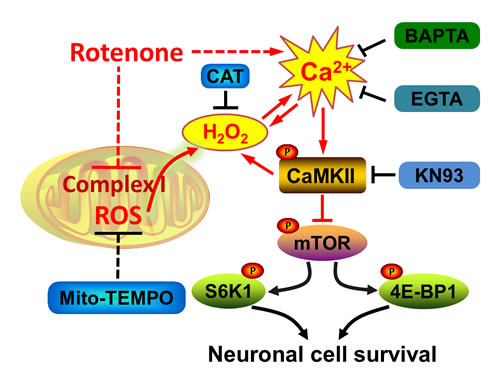 In this study, we also noticed that expression of mTOR-wt or S6K1-ca, or silencing 4E-BP1 attenuated rotenone-induced elevation of [Ca2+]i, phosphorylation of CaMKII, and neuronal apoptosis (Figure 7 and Figure S5). The results suggest that on one hand, rotenone induces [Ca2+]i and mitochondrial H2O2, resulting in elevation of inhibition of mTOR, and induction of neuronal apoptosis; on the other hand, activation of mTOR pathway can, in turn, partially prevent rotenone from increasing [Ca2+]i and mitochondrial H2O2 and thus attenuating rotenone-induced neuronal apoptosis. Currently we have no clue regarding how mTOR regulates [Ca2+]i and mitochondrial H2O2 in the cells in response to rotenone.