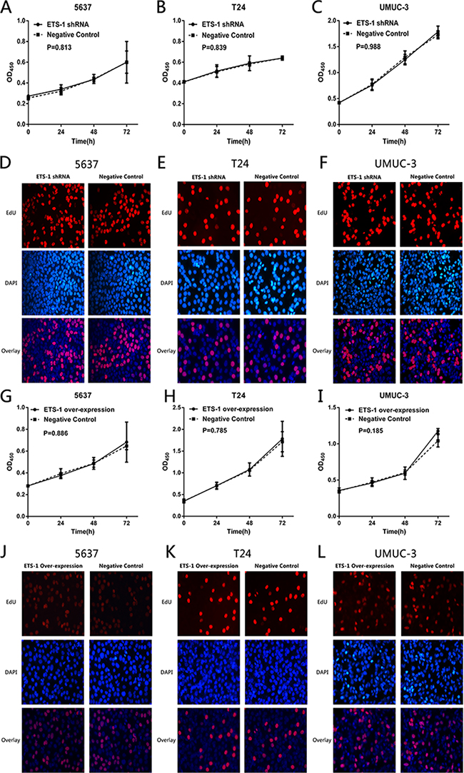 Figure 5: ETS-1 do not control cell proliferation in bladder cancer. Cell proliferation was measured by CCK-8 assay and EdU assay. There was no difference in cell proliferation rate between the treated group in bladder cancer 5637 cells (A, D, G, J), T24 cells (B, E, H, K) and UMUC-3 cells (C, F, I, L). The data are presented as mean ± SD. Assays were repeated at least three times.