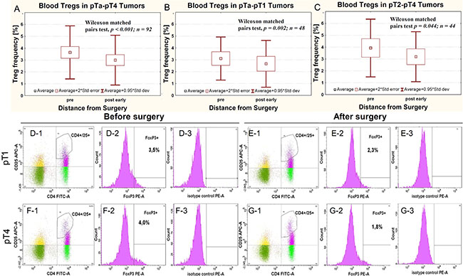 Figure 1: Average Treg frequency in peripheral blood relative to surgery in all pTa-pT4 cancers (A) and in cases subgrouped as pTa-pT1 (B) and pT2-pT4 (C). Representative Treg frequency in patient with pT1 (D-1, D-2, D-3, E-1, E-2, E-3) and pT4 (F-1, F-2, F-3, G-1, G-2, G-3) urinary bladder cancers, evaluated before (D-1, D-2, D-3, F-1, F-2, F-3) and after surgery (E-1, E-2, E-3, G-1, G-2, G-3). The D-1, E-1, F-1 and G-1 panels show the gate on double-positive CD4+ CD25+ cells. Blue dots represent CD4+ CD25+FoxP3+ cells. The D-2, E-2, F-2 and G-2 panels show the histogram representing FoxP3 staining (FoxP3+). The gates within Figures D-1, E-1, F-1 and G-1 represents CD4+ CD25high+FoxP3+ cells. Figures D-3, E-3, F-3 and G-3 show isotype controls used for gating FoxP3-positive cells.