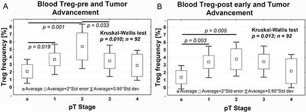 Figure 2: Average Treg frequency in peripheral blood relative to the pTa–pT4 progression of tumors before (A, Treg-pre) and after (B, Treg-post early) surgery. The Dunn’s post hoc test followed significant Kruskal-Wallis test to compare Treg frequency between pT stages.