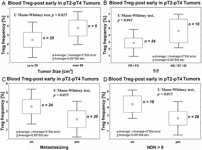Bigger size of pT2–pT4 tumors was associated with higher frequency of Tregs after surgery (Figure 3A), while small size of the tumor was associated with a sustained depletion of Tregs after surgery within the range of Treg-post early (evaluated 1 day after the surgical treatment) and Treg-post late (evaluated 7–10 days after the surgical treatment) values compared with Treg-pre (p = 0.029, data not shown). Furthermore, muscle invasive tumors (pT2-pT4) demonstrating histologically more aggressive type of invasion (nested, styloid and/or dispersive) were associated with significantly higher Treg-post early frequency (Figure 3B). After surgery, the average Treg-post early frequency was higher in nonmetastatic vs metastatic tumors (Figure 3C) and in classically differentiated tumors than they were in tumors with one or more nonclassical differentiates (NDN > 0) (Figure 3D). There was no significant correlation between Treg frequency and tumor grading (not shown). Analysis of the Treg frequency before and after tumor-removal surgery showed a significant decrease in the Treg frequency after TUR-Tu or radical cystectomy in both pTa (U Mann-Whitney test, p = 0.004) and pT2 (U Mann-Whitney test, p = 0.030) tumors, respectively (data not shown).