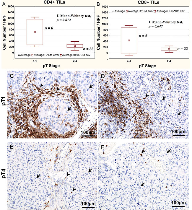 Figure 4: Average CD4+ (A) and CD8+ (B) TILs number, as determined using immunohistochemistry, relative to the stage of bladder cancer progression. Representative immunostaining of CD4 (C, E) and CD8 (D, F) lymphocytes in pT1 (C, D) and pT4 (E, F) tumors. Arrows point at nuclei of tumor cells, arrow heads point at CD4-positive or CD8-positive cells.