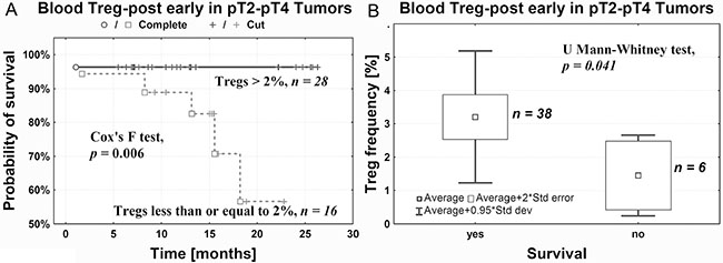 Figure 5: Probability of survival after cystectomy is positively correlated with Treg-post early frequency in peripheral blood (A) and negatively with death rate (B).