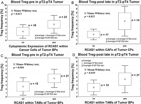 Figure 6: Average Treg-pre frequency in peripheral blood relative to RCAS1 expression assessed using immunohistochemistry within cancer cells of tumor BPs (A), CAFs in tumor CPs (B), TAMs in tumor BPs: before (C) and long after (D) surgery.