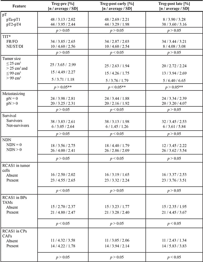 In pT2–pT4 tumors, we observed an increase in Tregs frequency before surgery (Treg-pre) in tumors with cytoplasmic expression of RCAS1 in the border parts (BPs) of the tumor, characterized by a high mitotic index, the presence of small nests of tumor cells, inflammatory infiltration, and/or type of stromal modeling pattern (Figure 6A). Correspondingly, in the central parts of the tumors (CPs) the presence of CAFs expressing RCAS1 within the tumor stroma was significantly associated with higher frequency of Tregs over a longer period after surgery (Treg-post late) (Figure 6B). Similarly, higher frequencies of Tregs were both observed prior to surgery (Treg-pre) and after longer postsurgery period (Treg-post late), and they were significantly associated with the presence of tumor-associated macrophages in the border parts of the tumor (BP-TAMs) expressing RCAS1 within the tumor stroma (Figure 6C, 6D). The definition of CPs is presented in Materials and Methods section. Summary of results is presented in Table 1.