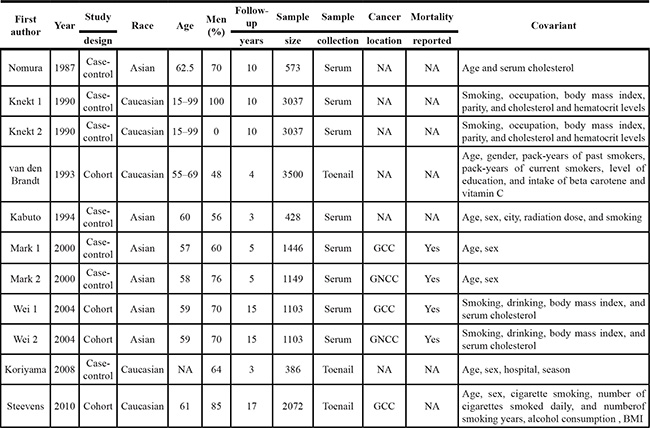 Studies included in this meta-analysis have to meet the following criteria: (1) case–control study or cohort study studying on association between selenium and risk of GC or GC mortality; (2) all patients with the diagnosis of GC confirmed by pathological or histological examination; (3) sufficient published data about sample size, odds ratio (OR), and their 95% confidence interval (CI). Studies wereexcluded when they were: (1) not case–control study orcohort study; (2) duplicate of previous publication; (3) based on incomplete data; (4) meta-analyses, letters, reviews, or editorial articles.