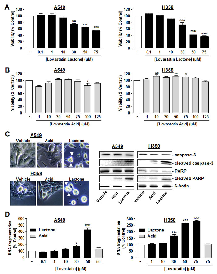 Figure 1 : Effect of lovastatin lactone and lovastatin acid on cellular viability and apoptosis of A549 and H358 cells. A., B. A549 cells (left panels) or H358 cells (right panels) were incubated with the indicated concentrations of lovastatin lactone A. or lovastatin acid B. for 48 h (WST-1 test). C., left Microscopic images were taken following a 24-h incubation period of A549 cells or H358 cells with vehicle, 50 µM (A549), or 75 µM (H358) lovastatin lactone (lactone) or lovastatin acid (acid), respectively. Arrowheads indicate cells with characteristic apoptotic morphology. C., right Western blots analyses of caspase-3, cleaved caspase-3, PARP and cleaved PARP in response to lovastatin lactone and acid (both at 50 µM in A549 and at 75 µM in H358) following a 48-h incubation period. Cleaved caspase-3 appears as a 17 kDa band (lower band). Images of Western blot analyses depict one representative Western blot result of 4-8 independent experiments. D. Quantification of DNA fragmentation following a 48-h incubation of A549 cells (left panel) or H358 cells (right panel) with the indicated concentrations of lovastatin lactone (black bars) or lovastatin acid (gray bars). Percent control represents comparison with vehicle-treated cells (100%) in the absence of test substance. Values are mean ± SEM of n = 3 -10 (A, left), n = 8-13 (A, right), n = 5 - 11 (B, left), n = 5 - 15 (B, right), n = 4 (D, left), n = 3-4 (D, right). *P < 0.05; **P < 0.01; ***P < 0.001 vs. corresponding vehicle control; one-way ANOVA plus Dunnett test (A; B; D). In histograms the vehicle control bars do not contain SEM with respect to different numbers of experiments that were carried out with different concentrations. However, statistical evaluation was only carried out using vehicle controls of the actual experiment.