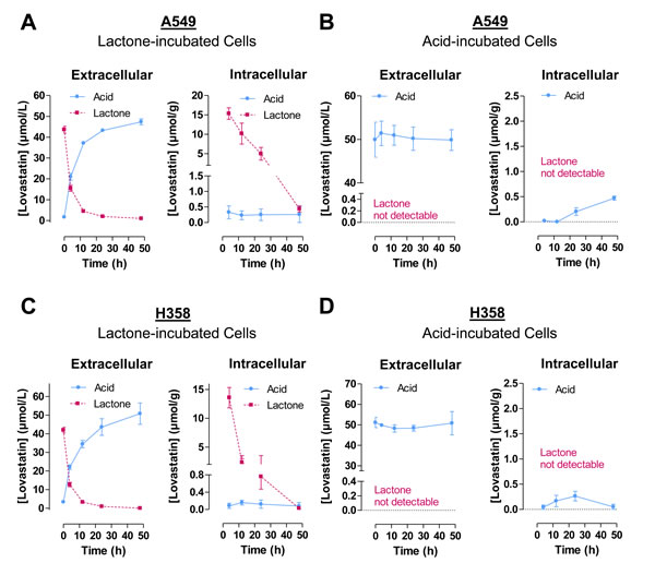 Incubation of cells with the acid form of lovastatin resulted in constant extracellular concentrations of this compound and no measurable lactone levels in cell culture supernatants of both A549 and H358 cells (Figure 2B, 2D, left).