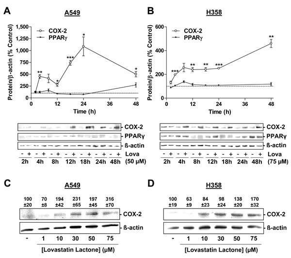 Figure 4: Effect of lovastatin lactone on COX-2 and PPARγ protein expression in A549 and H358 cells. A., B. Western blot analysis of the effect of 50 µM (A, A549) and 75 µM (B, H358) lovastatin lactone on COX-2 and PPARγ protein expression over a 48-h incubation period. C., D. Concentration-dependent effect of lovastatin lactone on COX-2 protein expression following a 24-h incubation period of A549 (C) and H358 (D) cells. Densitometric evaluations of Western blots are presented as percent of vehicle control (100%) in the charts (A,B; vehicle indicated as dashed line) or above the blots (C; D). All densitometric values were normalized to ß-actin. Values are mean ± SEM of n = 3- 4 (A), n = 4 - 8 (B) or n = 4 (C; D) blots. *P < 0.05; **P < 0.01; ***P < 0.001 vs. corresponding vehicle control; Student´s t test (A; B).