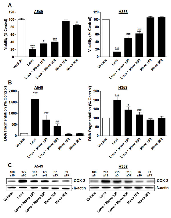Figure 5: Impact of mevalonic acid on modulation of viability, DNA fragmentation and COX-2 expression by lovastatin lactone in A549 and H358 cells. Mevalonic acid at 100 or 500 µM was added 1 h prior to addition of lovastatin lactone at 50 µM (A549) or 75 µM (H358) and incubation was continued for another 48 h (A549) or 24 h (H358). A., B. Viability (WST-1 test) and DNA fragmentation analyses. C. Western blot analyses of COX-2 expression. Densitometric evaluations of Western blots are presented as percent of vehicle control (100%). All densitometric values were normalized to ß-actin. Values are mean ± SEM of n = 12 (A), n = 4 (B, left; C, left), n = 8 (B, right) or n = 3 (C, right). *P < 0.05; ***P < 0.001 vs. corresponding vehicle control; #P < 0.05; ###P < 0.001 vs. lovastatin lactone; one-way ANOVA plus Bonferroni test.