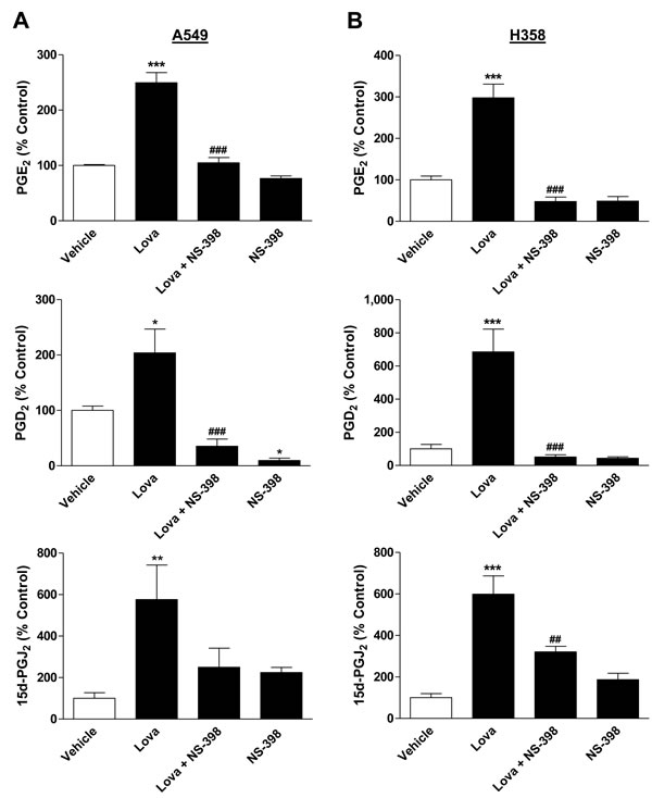 Figure 6: Effect of lovastatin lactone on PG synthesis by A549 and H358 cells. A., B. Cells were treated with vehicle or lovastatin lactone at 50 µM (A, A549) or 75 µM (B, H358) for 24 h in the presence or absence of NS-398 (1 µM) that was added to the cells 1 h prior to the incubation with lovastatin lactone. PG levels were determined in cell culture media and were normalized to total cellular protein amounts. Percent control represents comparison with vehicle-treated cells (100%) in the absence of test substances. Basal, protein-unnormalized PG levels in cell culture media of vehicle-treated cells were as follows: PGE2, 98.27 ± 5.97 pM (A549); PGE2, 39.05 ± 1.33 pM (H358); PGD2, 34.84 ± 9.13 pM (A549); PGD2, 16.60 ± 3.19 pM (H358); 15d-PGJ2, 14.76 ± 4.75 pM (A549); 15d-PGJ2, 18.65 ± 2.80 pM (H358). Values are mean ± SEM of n = 4 (A, PGE2; B, 15d-PGJ2), n = 8 (A, 15d-PGJ2), n = 7 - 8 (A, PGD2), n = 3 - 4 (B, PGD2) and n = 2 - 4 (B, PGE2 [2 values of the group treated with NS-398 were below the limit of PGE2 detection]). *P < 0.05; **P < 0.01; ***P < 0.001 vs. corresponding vehicle control; ##P < 0.01; ###P < 0.001 vs. lovastatin lactone, one-way ANOVA plus Bonferroni test.