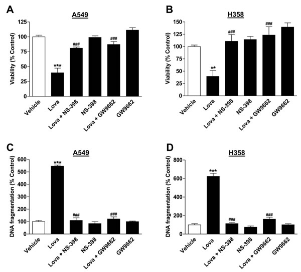 Figure 7: Impact of NS-398 and GW9662 on lovastatin lactone-induced apoptotic cell death. Viability (A., B.; WST-1 test) and DNA fragmentation (C., D.; DNA fragmentation assay) of A549 and H358 cells. NS-398 (1 µM) or GW9662 (10 µM) were added to the cells 1 h prior to lovastatin lactone (50 µM in A549; 75 µM in H358) or vehicle and incubation was continued for another 48 h (WST-1 test) or 24 h (DNA fragmentation). Percent control represents comparison with vehicle-treated cells (100%) in the absence of test substances. Values are mean ± SEM of n = 13 - 14 (A), n = 9 - 10 (B), n = 4 (C; D), **P < 0.01; ***P < 0.001 vs. vehicle control; ###P < 0.001 vs. lovastatin lactone, one-way ANOVA plus Bonferroni test.