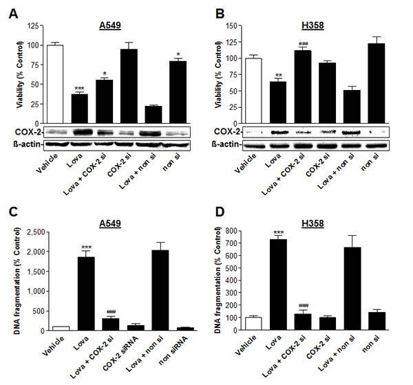 Figure 8: Impact of COX-2 siRNA on lovastatin lactone-induced apoptotic cell death of A549 and H358 cells. Effect of COX-2 siRNA on cellular viability (A., B., upper panel; WST-1 test), COX-2 protein expression (A., B., lower panel; Western blot analyses) and DNA fragmentation (C., D.; DNA fragmentation assay) in the presence or absence of 50 µM (A,C; A549) or 75 µM (B,D; H358) lovastatin lactone. Cells were incubated with lovastatin lactone or vehicle for 48 h (A; B) or 24 h (C; D) Transfection with COX-2 siRNA (2.5 µg/ml) or the respective equal concentration of non-silencing siRNA was performed 24 h prior to addition of test compounds to the cells. β-actin was used as loading control for Western blot analysis. Percent control represents comparison with vehicle-treated cells (100%) in the absence of test substances. Values are mean ± SEM of n = 4 (A), n = 6 (B), n = 3 - 4 (C; D). *P < 0.05; **P < 0.01; ***P < 0.001 vs. vehicle control; #P < 0.05; ###P < 0.001 vs. lovastatin lactone; one-way ANOVA plus Bonferroni test.