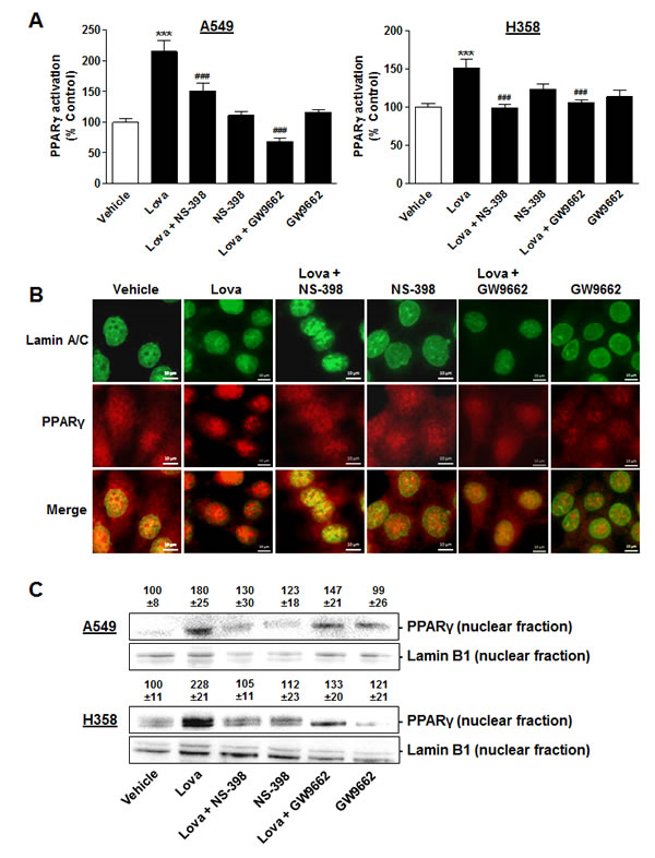 Figure 9: Impact of COX-2 and PPARγ inhibition on PPARγ translocation in A549 and H358 cells. A., B. Fluorescence microscopic analyses in cells treated with lovastatin lactone at 50 µM (A549, A, left panel) or 75 µM (H358, A, right panel, images in B) in the presence or absence of NS-398 (1 µM) and GW9662 (10 µM). Cells were pretreated with NS-398 or GW9662 1 h prior to addition of lovastatin lactone. Thereafter, incubation was continued for another 12 h (A549) or 24 h (H358). PPARγ activation was quantified by measuring colocalization of PPARγ and nuclear regions. Nuclear regions were identified via visualization of lamin A/C by an antibody that was stained by a goat anti-mouse Alexa Fluor® 488 labelled secondary IgG (green dye). PPARγ was stained by antibody binding and subsequent goat anti-rabbit Alexa Fluor® 555 labelled secondary IgG (red dye). Pictures show representative immunocytochemical images of PPARγ and nuclei (lamin A/C) in H358 cells (B). Percent control (A) represents mean ± SEM of n = 20 nuclei per sample for each cell line. ***P < 0.001 vs. vehicle control; ###P < 0.001 vs. lovastatin lactone; one-way ANOVA plus Bonferroni test. C. Western blot analysis of PPARγ protein levels in nuclear fractions of cells treated with vehicle or lovastatin lactone at 50 µM for 18 h (A549) or 75 µM for 24 h (H358). Values above the blots indicate densitometric analysis given as percent control ± SEM in comparison with vehicle-treated cells (100%) in the absence of test substances normalized to the nuclear protein lamin B1 of n = 4 (A549) or n = 5 (H358) experiments.