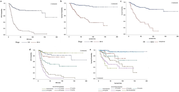 The prognostic value of CA-125 normalization in patients with ovarian CCC has not been well studied. Tian et al. [17] compared clinical outcome in patients with advanced CCC whose CA125 levels normalized to patients whose CA125 levels failed to normalize by the end of treatment. They concluded that CA-125 normalization by the end of treatment could be a valid indicator of RFS and OS, and likely reflected the degree of inherent chemosensitivity. However, the predictive role of CA-125 normalization was not stratified or compared with different cycles of chemotherapy in that study, likely due to their relatively small sample size (only 77 patients had CA-125 data recorded during treatment). Our analysis revealed that patient outcome grew worse as CA-125 normalization came later and later in the chemotherapy cycles. Indeed, CA-125 normalization before chemotherapy cycle 2 was a distinct inflection point for RFS and OS.