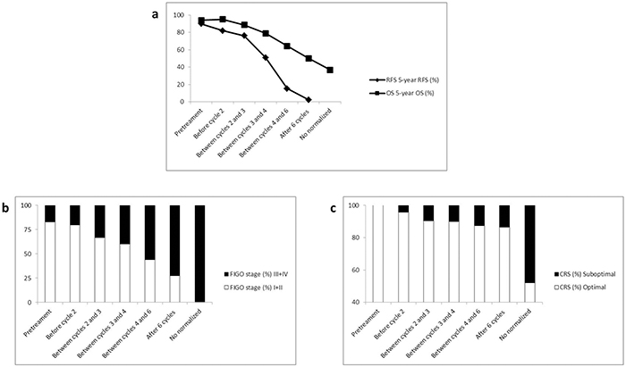 The rates of early-stage disease and negative residual tumor were markedly higher in patients whose CA-125 levels normalized before chemotherapy cycle 2 than in patients who normalized after the completion of chemotherapy cycle 1, when stratified by CA-125 normalization after chemotherapy. Linear correlation analysis also demonstrated that CA-125 normalization was positively correlated with advanced stage and suboptimal CRS, whereas it was negatively correlated with 5-year RFS and 5-year OS. CA-125 normalization before chemotherapy cycle 2 was associated with significantly higher rates of early-stage disease and negative residual tumor, which were identified as favorable factors for relapse and survival. Therefore, CA-125 normalization before chemotherapy cycle 2 may be a useful predictor for improved RFS and OS.