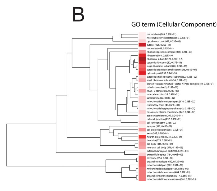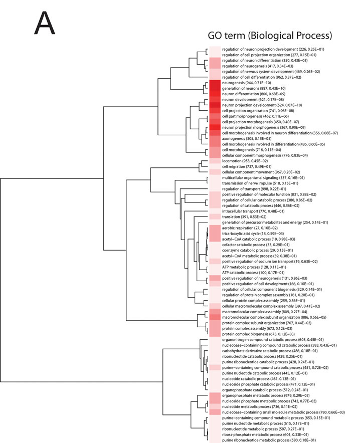 Significant enriched GO biological process terms in the mice exposed to acute stress included ‘neurogenesis’, ‘generation of neurons’, ‘neuron differentiation’, ‘neuron projection development and morphogenesis’ (Figure 1 A). Significant enriched GO cellular component terms included ribonucleoprotein complex, ribosome, ribosomal subunit, cytosolic ribosome, large ribosomal subunit, cytosolic large ribosomal subunit (Figure 1B).