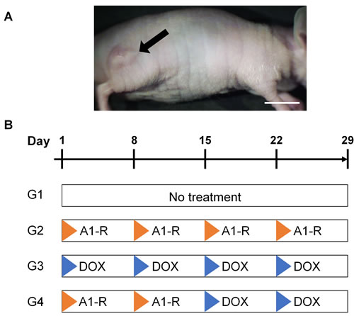 Figure 1: Treatment model and protocol. A. Soft tissue sarcoma PDOX mouse model. Ten days after surgical orthotopic implantation (SOI), tumors in the right biceps femoris muscle had grown more than 5 mm in diameter. Arrow indicates a grown tumor. Scale bar: 10 mm. B. Treatment protocol. G1: untreated control; G2: treated with S. typhimurium A1-R (A1-R)-alone (i.t., 5 × 107 CFU/body, weekly, 4 weeks) G3: treated with doxorubicin (DOX)-alone (i.p., 3 mg/kg, weekly, 4 weeks); G4: treated with S. typhimurium A1-R (i.t., 5 × 107 CFU/body, weekly, 2 weeks) followed by DOX (i.p., 3 mg/kg, weekly, 2 weeks). Each group contained 5 mice.
