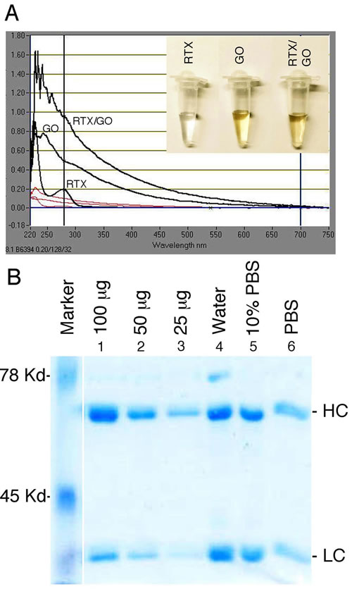 Figure 1: Association RTX with GO: The UV-Vis spectrum absorbance of free RTX, GO, and RTX/GO mixture is overlaid. A. Indicated quantity of RTX was loaded in lanes 1 through 3. RTX eluted from RTX/GO mixture that had been incubated at 37oC overnight in water, 10% and undiluted PBS were loaded in lanes 4, 5 and 6 respectively. HC and LC indicate the heavy and light chain of RTX respectively B.