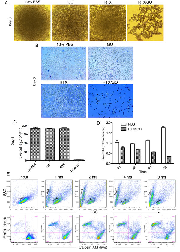 Figure 3: Cytotoxicity of RTX/GO to Raji cells: Microscopic image of undisturbed Raji cells cultured for 3 days with 10% PBS, GO, RTX and RTX/GO shows no appreciable cell proliferation in the culture with RTX/GO A. The cultured cells were washed with EDTA-containing buffer and stained with trypan blue to show primarily dead cell debris left in the culture with RTX/GO B. Trypan blue-stained Raji cells in the day 3 cultures were enumerated using a hemocytometer, and the number of live cells in each culture was plotted C. Raji cells were cultured with RTX/GO or 10% PBS as a control for 1, 2, 4 and 8 hours, and live cells were enumerated using a hemocytometer. The percentage of live cells relative to input cells at each time point was plotted D. Flow cytometry shows progressive loss of live cells with accumulation of dead cells as a function of time over the 8-hour culture period as revealed by FSC x SSC display or by the LIVE (Calcein AM) and DEAD (EthD1) dye stain e. The results are representative of more than three experiments.