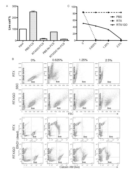 Figure 4: Role of complement in RTX/GO-mediated cytotoxicity: Raji cells were cultured overnight with 10% PBS or RTX/GO in RPMI 1640 media with or without 10% heat-inactivated fetal bovine serum (FBS, Sigma), percentages of live cells relative to the input cells are plotted A. Raji cells were opsonized either by RTX (upper panel) or RTX/GO (lower panel) for 2 hours followed by incubation with increasing concentration of rabbit complement for 45 minutes, stained with the LIVE (Calcein AM)/DEAD (EthD1) dye and analyzed by flow cytometry B., and the percentage of live cells is plotted c. The results are representative of three experiments.