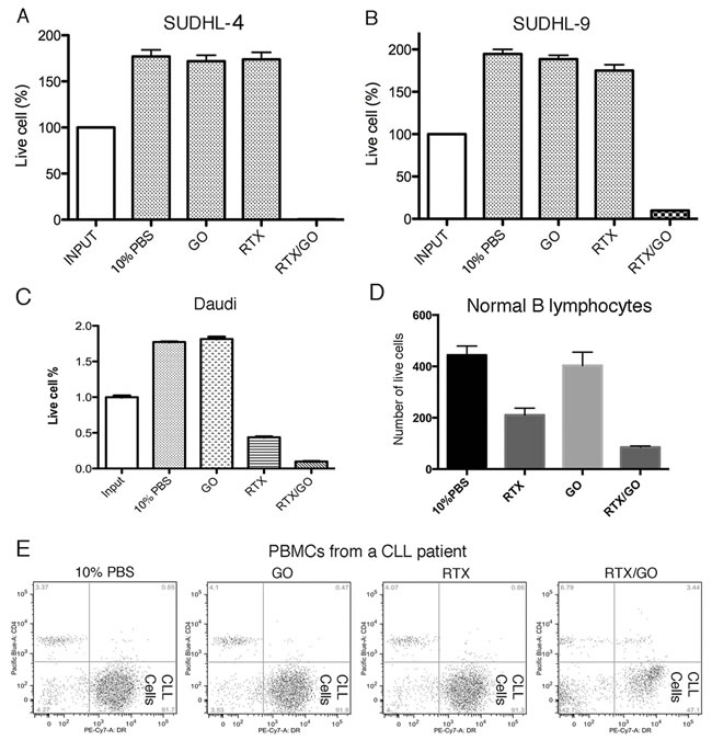 Figure 5: RTX/GO cytotoxicity on other lymphoma cells and normal B-lymphocytes: SUDHL-4 A., SUDHL-8/9 B., Daudi cells C., normal B lymphocytes D. and PBMCs from a patient with chronic lymphocytic leukemia e. were cultured for one day with10% PBS, GO, RTX or RTX/GO. The bar graph showed the percentages of live cells relative to input cells. The cultures were repeated at least three times.