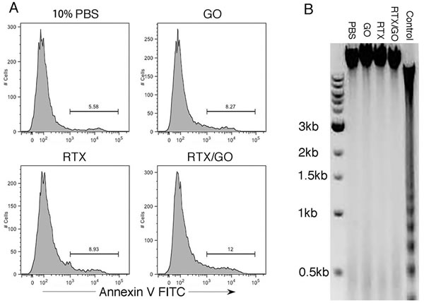Figure 6: Non-apoptotic nature of RTX/GO-induced cell death: Raji cells were cultured overnight with the indicated treatment, stained with apoptotic marker Annexin V, and analyzed by flow cytometry. No gate was applied on the displayed cells A. Gel electrophoresis of DNA isolated from Raji cells cultured overnight with 10% PBS, GO, RTX and RTX/GO. DNA isolated from mouse thymocytes that were cultured in plain medium for two days was used as an apoptosis positive control B. The experiments were repeated at least three times.