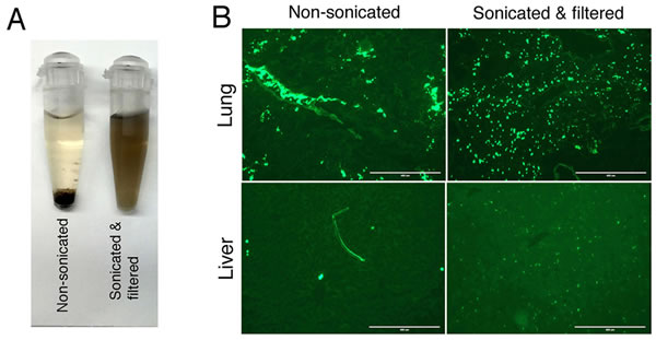 Figure 8: Stability and in vivo distribution of FITC-RTX/GO made from non-sonicated or sonicated/filtered GO: Non-sonicated or sonicated/filtered GO was mixed with human serum (10 µg/ml) and the GO serum dispersions were monitored for 21 days. Non-sonicated GO precipitated in four hours whereas sonicated/filtered GO remained in dispersion at least by day 21 A. RTX/GO made of either non-sonicated or sonicated/filtered GO with RTX-FITC was injected into NRG mice iv and organs were sampled 2 hours after injection. Fluorescence microscopy shows the distribution of FITC-RTX/GO in the lung and liver. The images were taken using EVOS Cell Imaging System, (AMF-4301), with scale bar showing 400 µ. The location of fluorescence derived FITC-RTX/GO made of sonicated/filtered GO in the liver is consistent with location of Kupffer cells B.