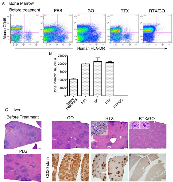 Eight days after Raji cell transplantation, extensive lymphoma infiltrates were identified in the bone marrow and liver (Figure 9A-9C); and treatments were then started. Four groups of mice, four to five in each group, were given intravenously PBS, GO, RTX, or RTX/GO respectively every two to 3 days for a total of three treatments. All the mice were sacrificed for analysis 3 days after the last treatment. Extensive human HLA-DR+/mouse CD45- lymphoma infiltrates were identified by flow cytometry in the bone marrows of the PBS, GO and RTX-treated animals but not in RTX/GO-treated ones (Figure 9A and 9B), indicating elimination of lymphoma cells at this location by RTX/GO but not by free RTX or GO. The Raji cell counts in the bone marrow of GO- and RTX-treated mice were similar to that of PBS-treated mice (Figure 9B), consistent with the results of the in vitro experiments showing that neither GO nor RTX is independently cytotoxic to Raji cells. Histological examination identified infiltrating lymphoma in the livers of all the PBS, GO and RTX-treated mice, which appeared as blue cell infiltrates on H&E stained sections (Figure 9C). Human CD20 staining confirmed that the liver infiltrates were composed of CD20+ lymphoma cells (Figure 9C). In RTX-treated mice, lymphoma infiltration was not as dense as in PBS or GO-treated mice, but frequent mitotic figures were readily identified within the lymphoma infiltrates (Figure 9C insert), indicating rapid proliferation and progression of the lymphoma cells despite RTX treatment. In sharp contrast, pathological examination as well as CD20 staining demonstrated no evidence of viable lymphoma in the livers of RTX/GO treated mice (Figure 9C). Only under high magnification microscopy could rare degenerated cellular elements be identified in the liver of some of the RTX/GO-treated mice, consistent with remnants of lymphoma cells killed by RTX/GO. No pathological abnormalities were identified in any major organs examined in the RTX/GO treated mice, including the heart, lung, kidney, liver (except for the presence of remnants of degenerated lymphoma cells), pancreas and GI tract. The physical and functional status of the mice was closely followed during the experiments. No evidence of morbidity of any degree was identified with RTX/GO treated mice, and they remained healthy throughout the course of treatment, suggesting that RTX/GO is non-toxic and safe. Taken together, these results demonstrate that RTX/GO has the capacity to diffuse out of the blood circulation, penetrate through the tissue to reach target cells, and rapidly eliminate established lymphomas in the absence of host effector mechanisms, while free RTX or GO fails to do so.