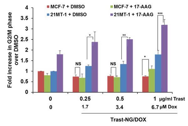 Figure 4: HSP90 inhibition potentiates the effect of Trast-NG/DOX on ErbB2-expressing breast cancer cells. The ErbB2-overexpressing 21MT-1 or ErbB2-low MCF-7 cells were plated in 6-well plates and triplicate wells were treated with the indicated concentrations of Trast-NG/DOX for 6h. Unbound Trast-NG/DOX was washed out and cells were cultured further in DOX-free media without or with 17-AAG (100 nM) for 18 h followed by the incubation with nanogel-free media. Cell cycle analysis was performed after 48 h of treatment. Shown are the fold increase in the % of cells in G2/M phase of the cell cycle for each treatment condition over DMSO control (the color coding is indicated inside the histogram). The number of asterisks indicates increasing significance (*, p < 0.05; **, p < 0.005; ***, p < 0.0005); NS, not significant.