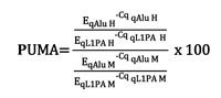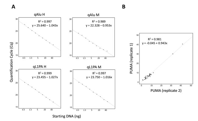 Figure 2: Evaluation of QUAlu technique. A. Standard curves showing the linear range of the different qPCRs performed in a QUAlu assay. HCT116 genomic DNA amounts ranging from 0.3 to 80 ng were used. B. Correlation of the percentage of unmethylated Alu elements (PUMA) determined by QUAlu in two independent experiments.