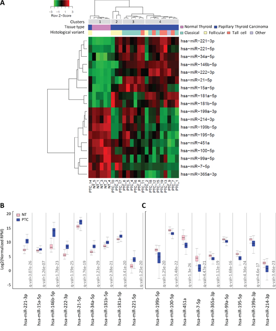 Figure 1: miRNA expression profiles in PTC clinical samples A. Heat map showing miRNAs differentially expressed between PTC and normal thyroid tissues (absolute FC≥1.5; FDR<0.05). B-C. miRNA expression in the validation set of 499 PTC and 59 normal thyroid tissues derived from TCGA. miR abundance is reported as log2 normalized (reads-per-million, RPM) median-centered; q-value, statistical significance calculated by Wilcoxon test adjusted by Benjamini-Hochberg correction.