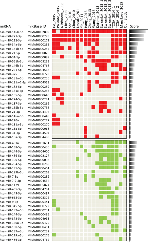 Figure 2: Meta-analysis of miRNA expression profiles in PTC versus normal thyroid. Study-miRNA matrix showing miRNA expression across the 15 studies selected from literature and our study. Color code: red, upregulated; green, downregulated. Score is calculated based on the reporting frequency of each miRNA. Matrix selectively represents only miRNAs reported in at least two independent studies (complete data available in Supplemental Table S3); the three and two datasets derived from study 13 (Swierniak 2013) and from study 14 (TCGA 2014), respectively, were considered as single studies.