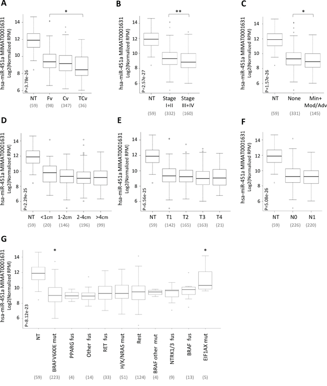 Figure 4: miR-451a expression relative to clinical pathological features and genetic lesions. miR-451a expression in the set of 59 normal thyroid (NT) and 499 PTC samples derived from TCGA and stratified according to A. histological type (Fv, Follicular variant; Cv, Classic variant; TCv, Tall Cell variant), B. pathological TNM stage, C. extrathyroid extension, ETE (None, absence of ETE; Min, Minimal; Mod/Adv, Moderate/Advanced), D. tumor size, E. T stage, F. N stage (N0, absence of lymph node metastases; N1 presence of lymph node metastases) and G. genetic lesion (mut, mutation; fus, fusion; Rest, samples harboring other genetic lesions). miR-451a abundance is reported as log2 normalized (reads-per-million, RPM) and represented by box plots. In parentheses the number of samples included in each group. P, statistical significance by Kruskal-Wallis test. * p-value<0.05, ** p-value<0.01 by Wilcoxon test.