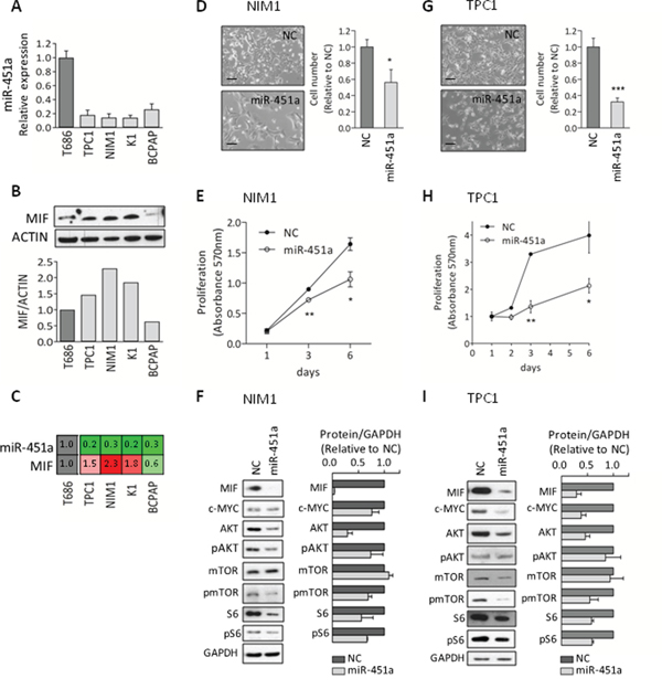 Figure 5: miR-451a functional studies A. miRNA-451a expression by qRT-PCR in the PTC-derived cell lines TPC1, NIM1, K1 and BCPAP, and in the normal thyroid control cells T686. Data are presented relative to the value of T686 cells. B. MIF protein expression by western blot analysis (WB) in the same panel of cell lines; Actin is shown as loading control. Below the corresponding densitometric quantification; MIF expression was normalized to Actin and presented relative to the level of T686 cells. C. Relative expression of the pair miR-451a and MIF; data are derived from the analyses reported in (A) and (B). D-I. Functional studies in NIM1 and TPC1 cells either transfected with miR-451a synthetic mimic (miR-451a) or Negative-Control (NC). D, G. Representative images of transfected cells (LEICA inverted microscope, scale bar 100μm). Cell number was determined by nuclei staining; data are presented relative to NC-transfected cells. E, H. Cell proliferation following transfection. F, I. WB analysis (day 3 after transfection). Protein expression was quantified and normalized to the loading control GAPDH. Data are presented relative to NC-transfected cells. Graphs report mean ± s.e.m. of at least two independent experiments. * p-value<0.05, ** p-value<0.005, *** p-value<0.0001 by Student’s t-test.