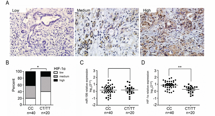 To assess whether this HIF1A SNPs could confer in PDAC risk, we first conducted a case-control population study and observed that the variant genotypes of HIF1A rs2057482 located 8bp downstream of the binding site of miR-199a confers an increased risk of development of PDAC in this large cohort of Chinese population. The frequency of distribution of HIF1A SNP CC genotype is significantly correlated with tumor size and lymph node metastasis.