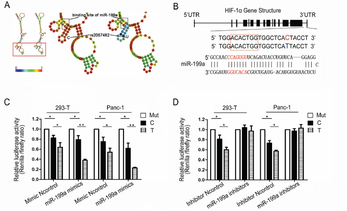 Figure 3: miR-199a differential regulation of the SNP rs2057482. A. The predicted secondary structure of the HIF-1α mRNA. The secondary structures of the 3’UTR of HIF1A were predicted by inputting two 302-nt long DNA sequences centering rs2057482 into RNA fold, with either the rs2057482-C (left) or rs2057482-T (right) allele. The figures and the values of minimum free energy (MFE) were generated by RNAfold (http://rna.tbi.univie.ac.at); B. Schematic representation of the sequences of human miR-199a and its target site the 3’ UTR of HIF1A. The rs2057482 SNP is located 8 nucleotides (nt) downstream of the “seed complementary sequence” of miR-199a in HIF1A. C, D. Effects of rs2057482 genotypes on the expression of HIF1A gene in HEK-293T and Panc-1 cell lines. Forty-eight hours after transfection of the reporter gene and miR-199a mimic, the roles of construct with C or T allele on relative luciferase activity were compared in HEK-293T and Panc-1 cell lines (*P <0.05, **P <0.01). Data shown are mean ± SD of three independent experiments.