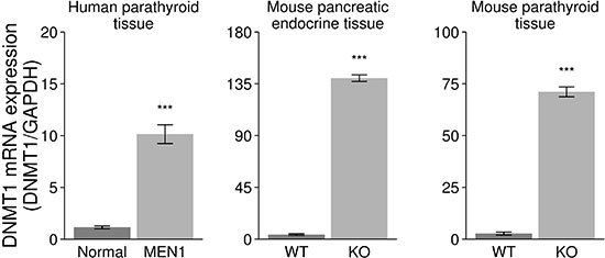 Figure 2: Increased expression of DNMT1 in the endocrine tumor tissues from human MEN1 parathyroids and Men1 KO mice. DNMT1 mRNA was significantly increased in the endocrine parathyroid tumors from MEN1 patients (MEN1) and pancreas and parathyroid from Men1 KO mice (KO) compared to normal endocrine tissues from human and control mice (WT) by real-time RT-PCR assay (***P < 0.001).