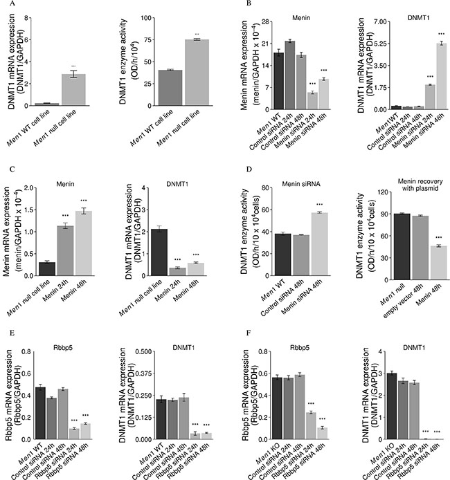 Figure 5: Menin suppresses DNMT1 expression and activity, but Rbbp5 enhances DNMT1 expression. mRNA expression and activity of DNMT1 was significantly increased in a Men1 null cell line as compared to a Men1 WT cell line (A). The expression and activity of DNMT1 was up-regulated with knockdown of menin (siRNA) in a mouse Men1 WT cell line (B and D) and the expression and activity of DNMT1 was down-regulated by inducing menin expression with a menin expression plasmid (C and D). However, knockdown of Rbbp5 with Rbbp5 siRNA reduced DNMT1 mRNA expression in both Men1 WT (E) and Men1 null mouse (F) cell lines. (***P < 0.001).