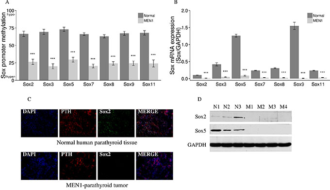 Figure 7: Aberrant methylation and expression of Sox genes in endocrine tumors from MEN1 patients. Multiple Sox genes were hypermethylated with P < 0.0001 (Sox promoter methylation in the y axis depict the mean of the loci specific methylation. 0, fully methylated, to 100, fully unmethylated) (A) which correlates with a decreased mRNA expression of Sox genes (B) in all human MEN1-parathyroid tumors as compared to normal parathyroid tissues. Sox2 was also decreased when comparing MEN1-parathyroid tumors to normal control tissues (C) by IF staining. PTH was stained red by anti-PTH antibody (Alexa Fluor 647); Sox2 was stained green by anti-Sox2 antibody (Alexa Fluor 488); and nuclei were stained blue with DAPI. Images were taken with the 20X objective. Sox2 and Sox5 expression were decreased in parathyroid tumors from MEN1 patients compared to controls by western blot assay (D). (*P < 0.05, **P < 0.01, ***P < 0.001). (Normal/N: human normal parathyroids; MEN1/M: human MEN1 parathyroids).