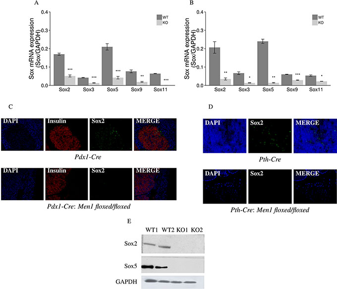 Five Sox genes (Sox2, Sox3, Sox5, Sox9, and Sox11) showed significantly decreased mRNA expression (from 4 to 12 fold) in the endocrine tumor tissues of the pancreas and the parathyroids from Pdx1-Cre:Men1 floxed/floxed and Pth-Cre:Men1 floxed/floxed KO mice compared to normal endocrine tissues from the pancreas and parathyroids from control Pdx1-Cre and Pth-Cre mice, respectively (Figure 8A and 8B). Decreased protein expression of Sox2 was also confirmed in endocrine tumors of the pancreas and parathyroids from the Men1 KO mice by IF and western blot assays (Figure 8C, 8D, and 8E).