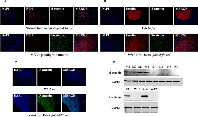 Figure 9: Hypermethylation of Sox genes results in increased β-catenin expression. The presence of β-catenin was significantly increased in parathyroid tissues from MEN1 patients (A), mouse pancreatic endocrine tumors (B), and mouse parathyroid tumors (C) from Men1 KO mice compared to normal endocrine tissues from humans and control mice by IF staining. PTH and insulin were stained red by anti-PTH antibody and anti-insulin antibody, respectively (Alexa Fluor 647); β-catenin was stained green by anti-β-catenin antibody (Alexa Fluor 488); and nuclei were stained blue with DAPI. Images were taken with the 20X objective. Increased β-catenin expression in parathyroid tumors from MEN1 patients and pancreatic endocrine tumors from Men1 KO mice was further confirmed by western blot assay (D).
